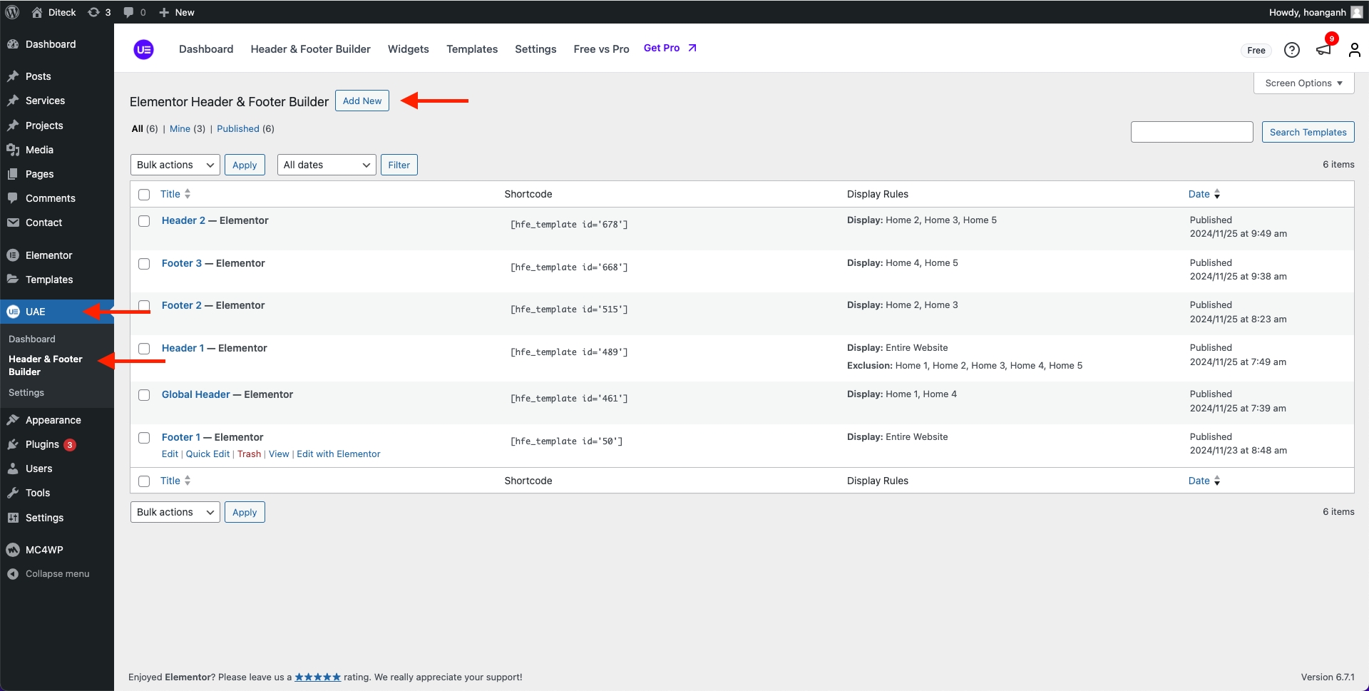 Choose the tab Header & Footer Builder and you can add the template that has been created to the page.