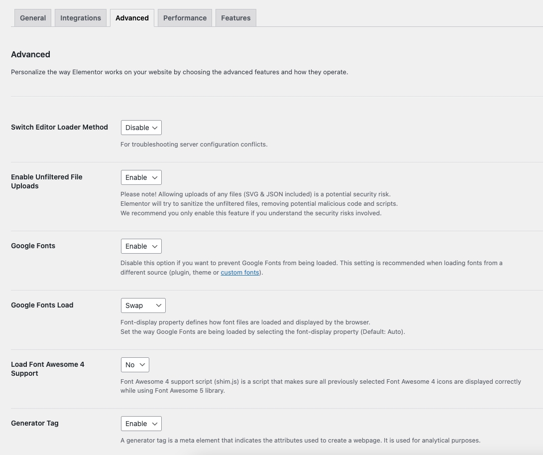 Step 6 - Intergrations and Advanced display config for elementor.