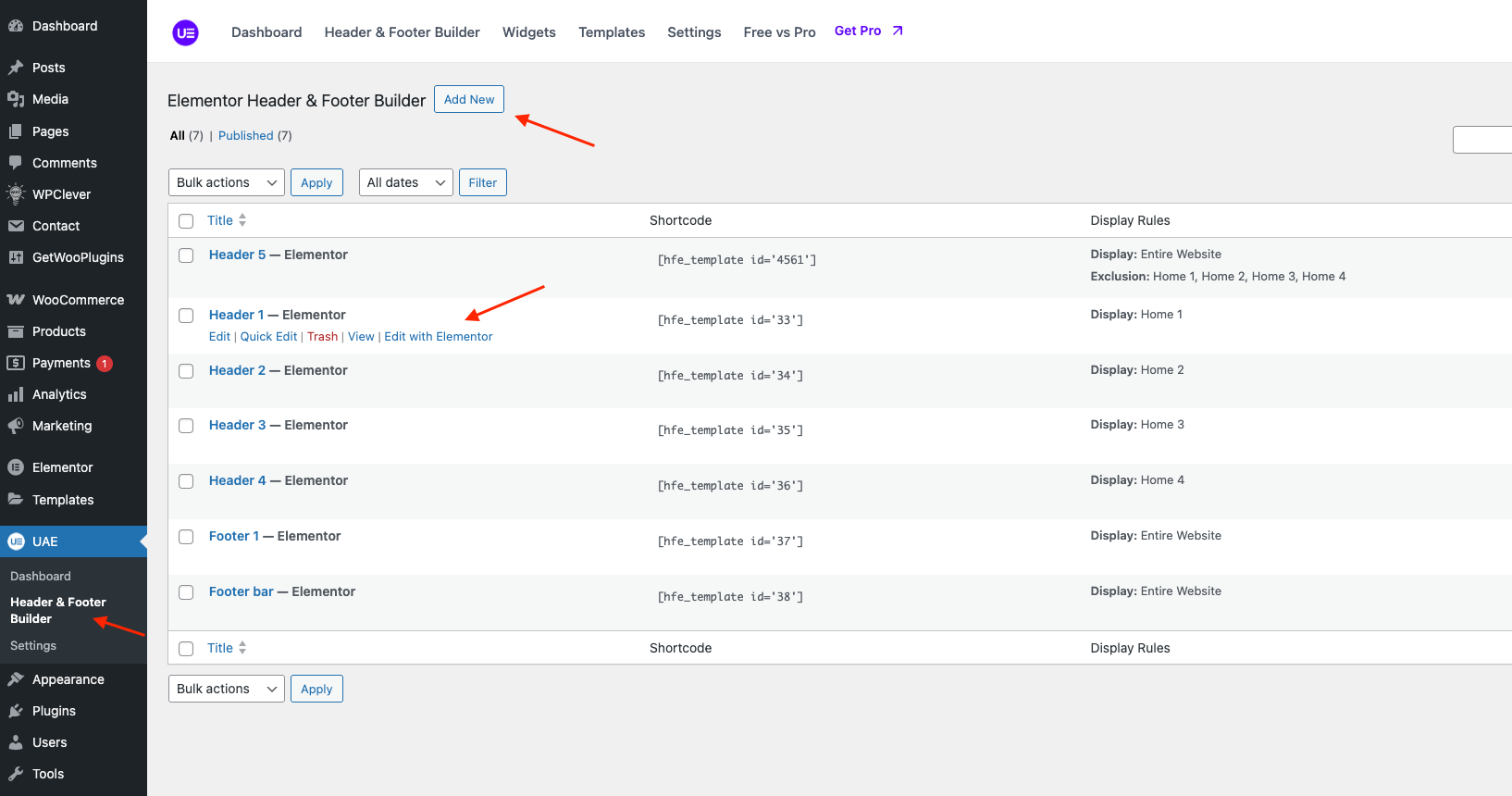 **Step 1:** Go to WordPress Dashboard > UAE > Header & Footer Builder > Add new