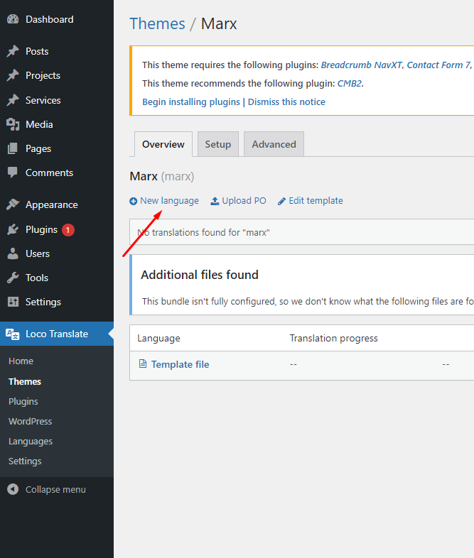 After synced the strings, the next step is to add new language you wish to translate. Go to Loco Translate -> Themes, select your theme and click on New Language.
