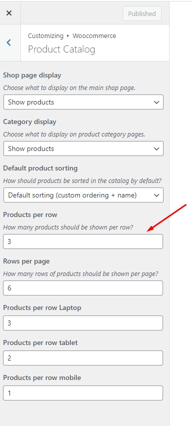 To set product per row, per page, you should tap "WordPress Dashboard -> Customize -> WooCommerce" then edit "Product Catalog"