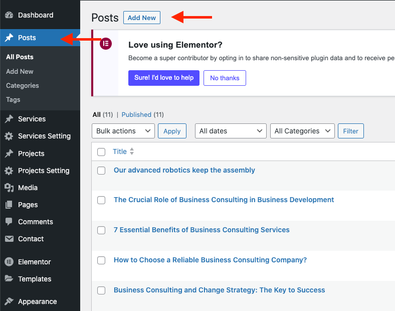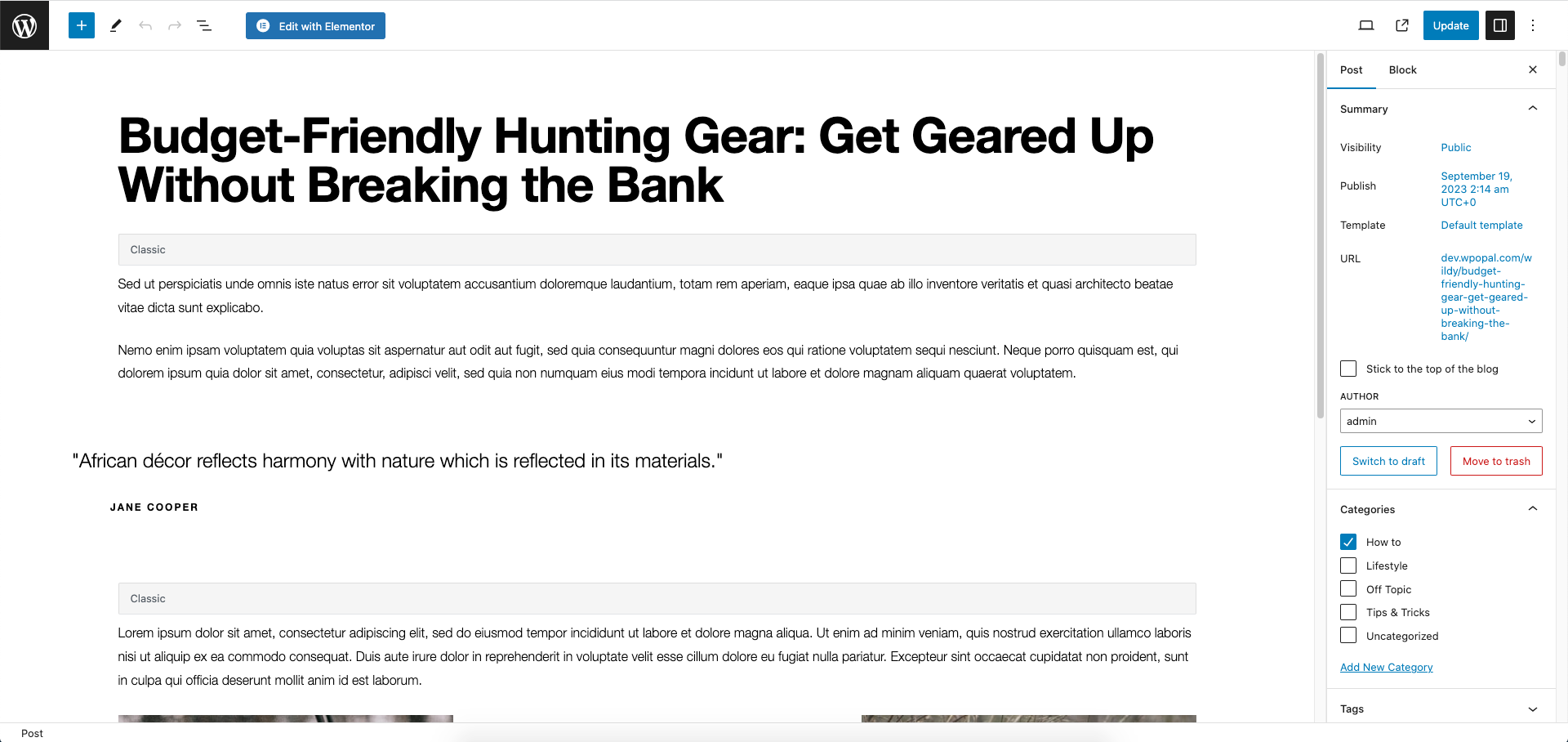 Step 4 - Start filling in the blanks: Enter your post title in the upper field, You can add content to the post by using Elementor to create.