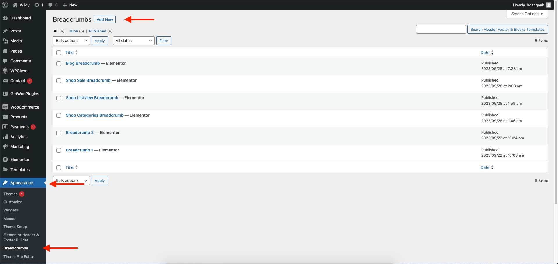 **Step 2 -** Click ‘**Add New**’ to Name your Breadcrumb template and click ‘**Publish**’ and '**Update**'.