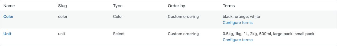http://yourstore.com/pa_color/black/to your menu to only display black clothing –pastands for “product attribute.”Select a Default sort order. Choose between “Name”, “Name (numeric)”, “Term ID” or “Custom ordering” where you decide by dragging and dropping the terms in the list when configuring the terms (see below). “Name (numeric)” is relevant if the values are numbers. If you select “Name”, it sorts alphabetically with 1 and 10 preceding 2. If you select “Name (numeric)” it sorts based on a numerical value.