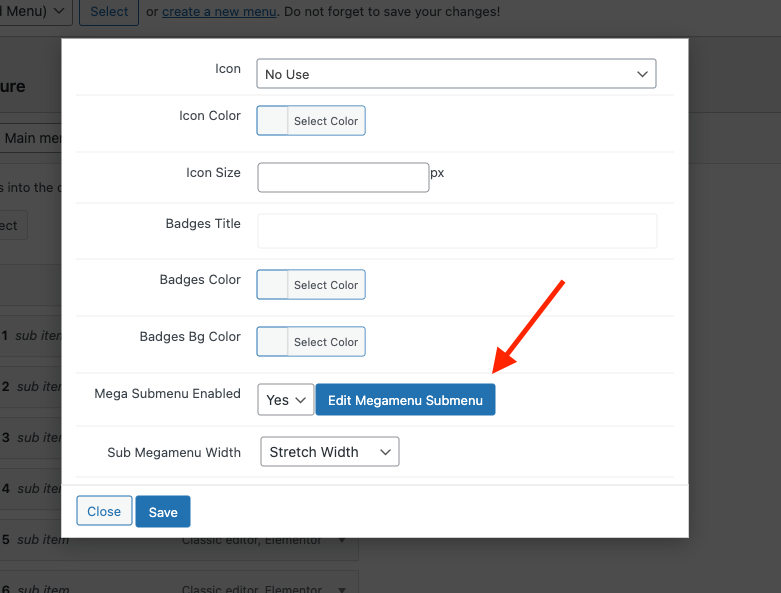 Step 5 - Click Edit Megamenu Submenu then a new window will appear. You can build a Mega menu by Elementor. After finishing click Update and click.
