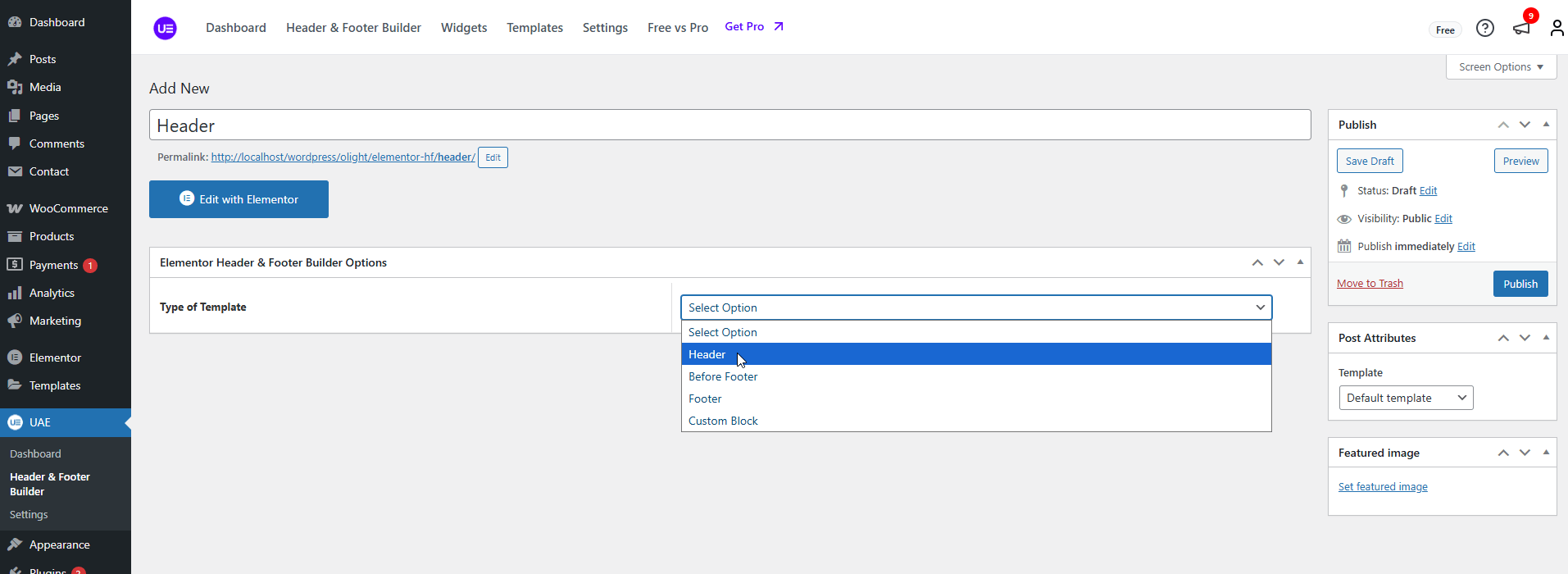 Add Title > Select Type of template > Header > Edit with Elementor.