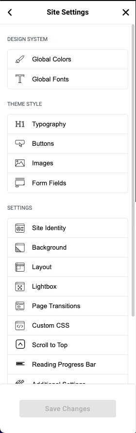 • Global Colors and Global Fonts are at the top of the Site Settings Menu.