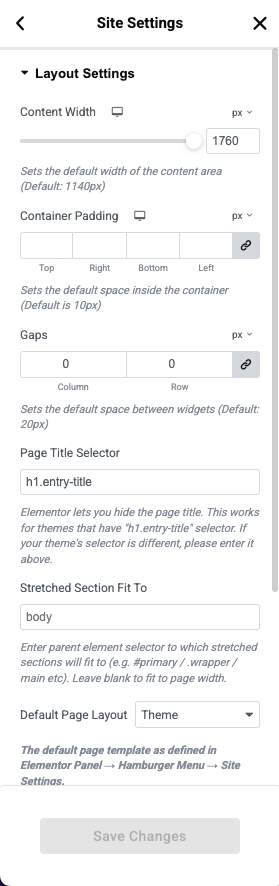 Default Page Layout: In general, pages are laid out according to the theme settings. However, you can use this setting to make Elementor Canvas or Elementor Full Width the default setting. For details, see How can I get a full screen canvas in the Editor?