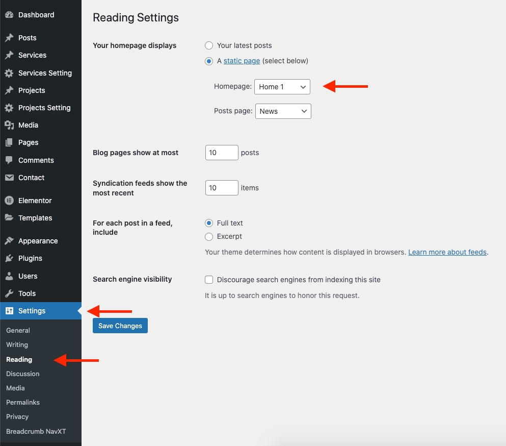 Step 1 - Go to Settings > Reading in your WordPress Dashboard panel.