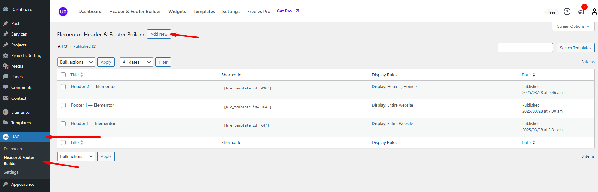 **Step 1 -** Go to WordPress **Dashboard** >  **UAE**  > **Header & Footer Builder** >  **Add new**.
