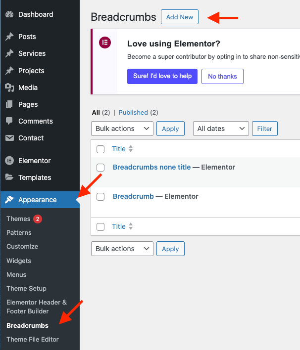 Step 1 - Go to WordPress Dashboard > Appearance > Breadcrumbs > Add New.