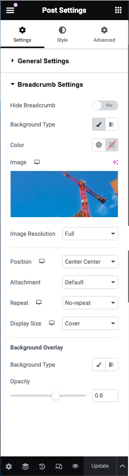 To set up your breadcrumb background you need to click on 'Post Settings'