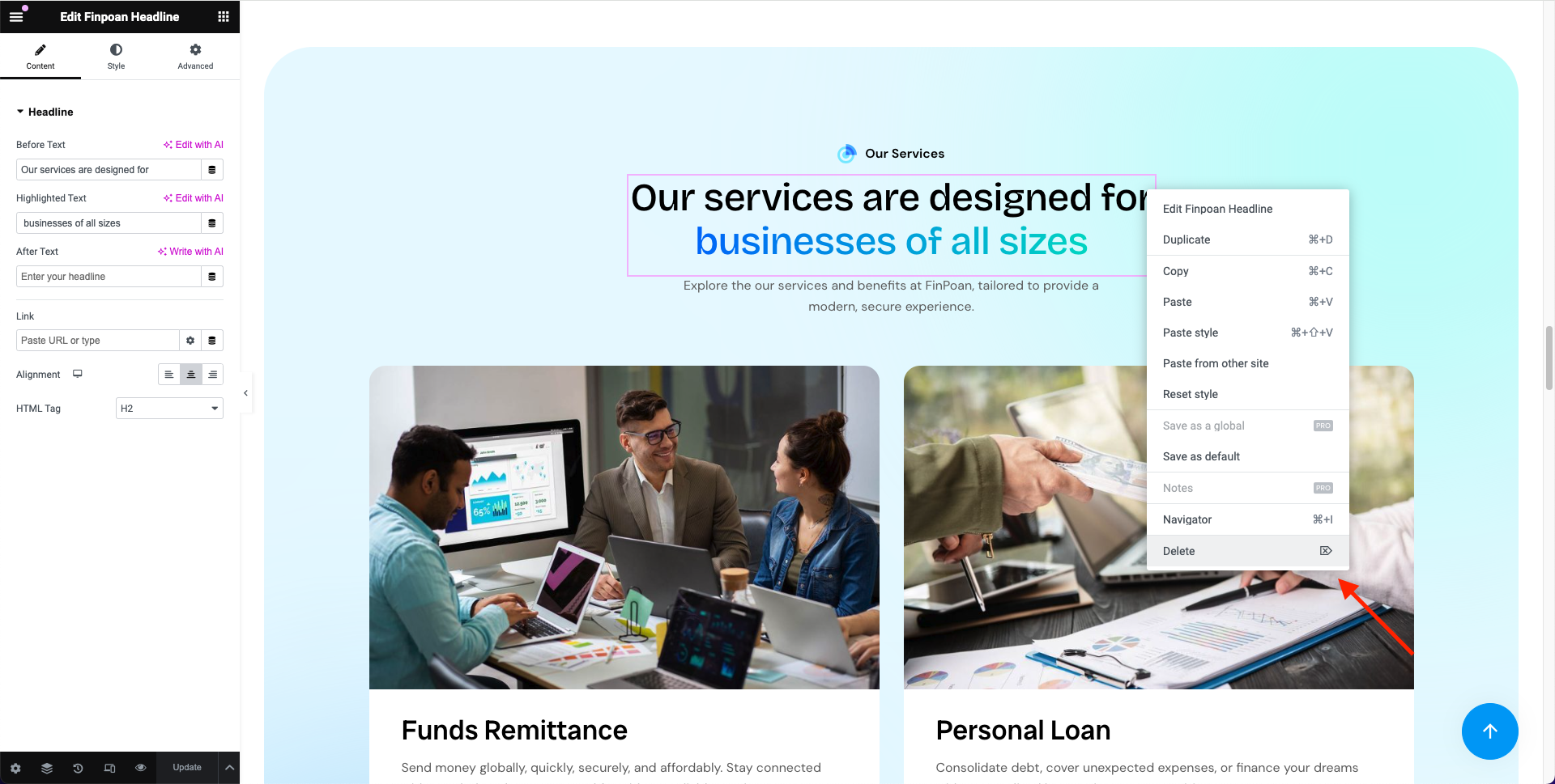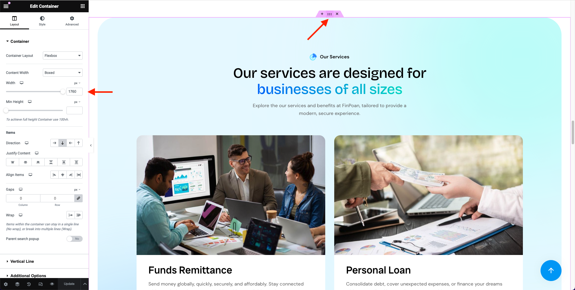 **Step 3** - To modify the container you need to click on the section that you want to edit when you click on to button all content will display in the left sidebar follow you can change it.