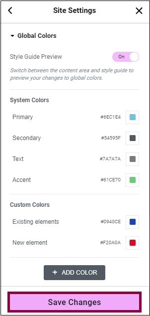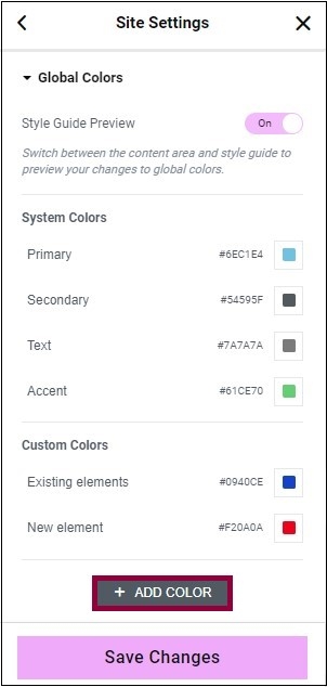 Global colors can be set and changed while editing pages, but they can also be viewed, added and changed from the global colors page.