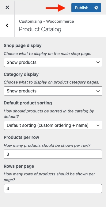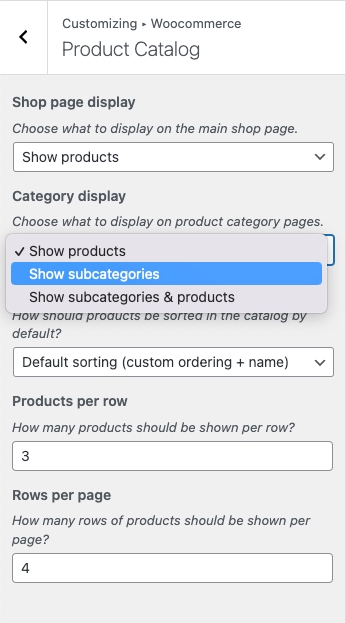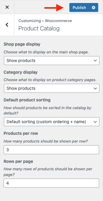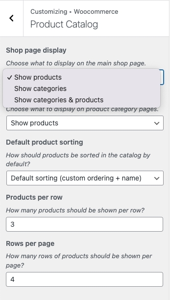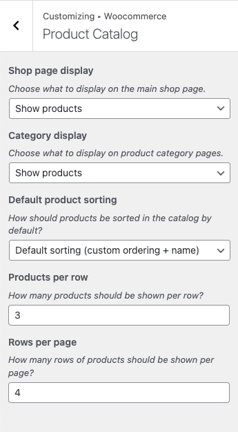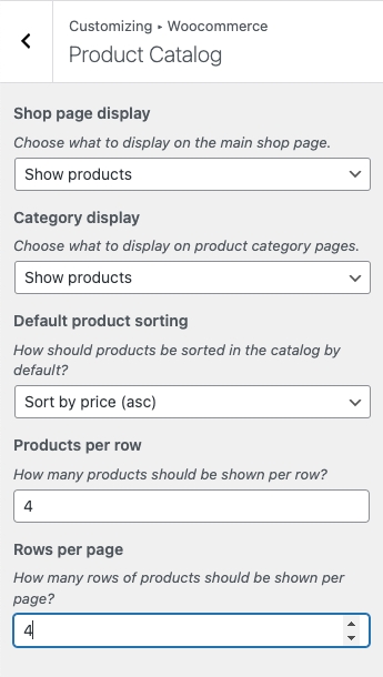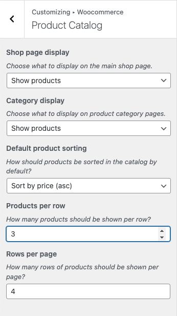 To edit the product catalog settings, navigate to Appearance > Customize > WooCommerce > Product Catalog. The next few sections of this page will explain each of these settings in more detail.