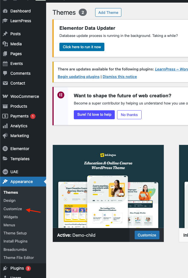 **Step 1** - Appearance >> Customize