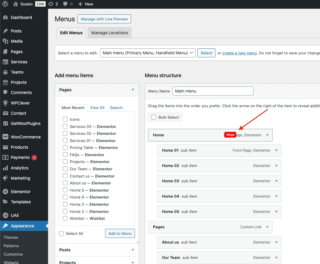 Step 3 - Click the button Mega to create the Mega menu for Item. So this Mega menu will show when you hover over the Item you choose to ad Mega menu.