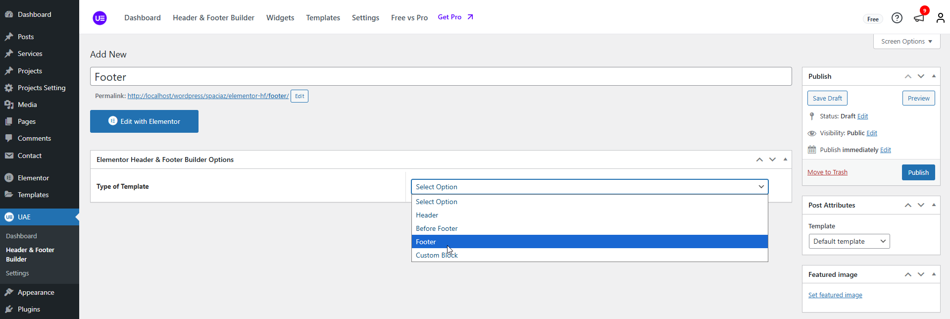 **Step 1 -** Go to WordPress **Dashboard** >  **UAE**  > **Header & Footer Builder** >  **Add new**