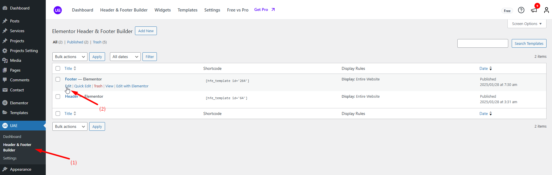 **UAE** > Choose the tab **Header & Footer Builder** and you can add the template that has been created to the page.