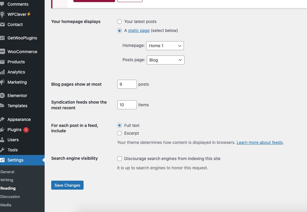 Step 1 - Go to Settings > Reading in your WordPress Dashboard panel.