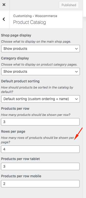 To set product per row, per page, you should tap "**WordPress Dashboard -> Customize -> WooCommerce" and** then edit **"Product Catalog"**