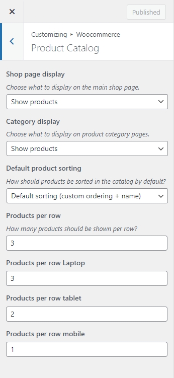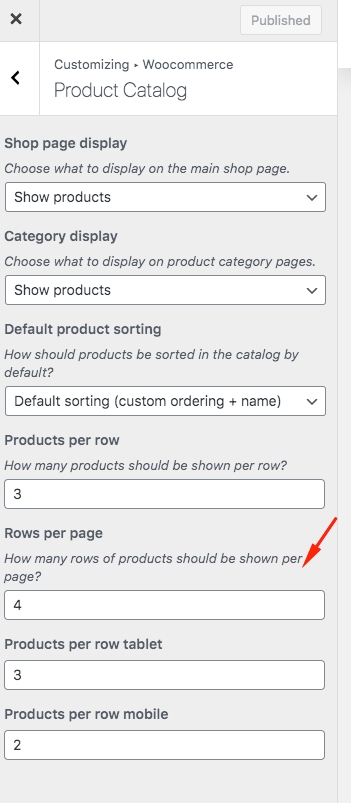 To set product per row, per page, you should tap "WordPress Dashboard -> Customize -> WooCommerce" and then edit "Product Catalog"