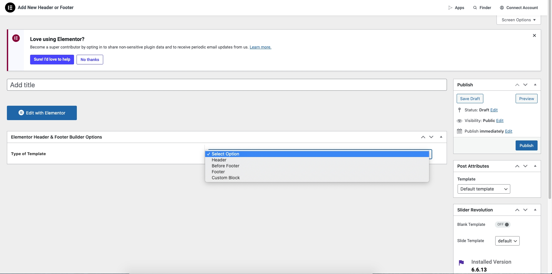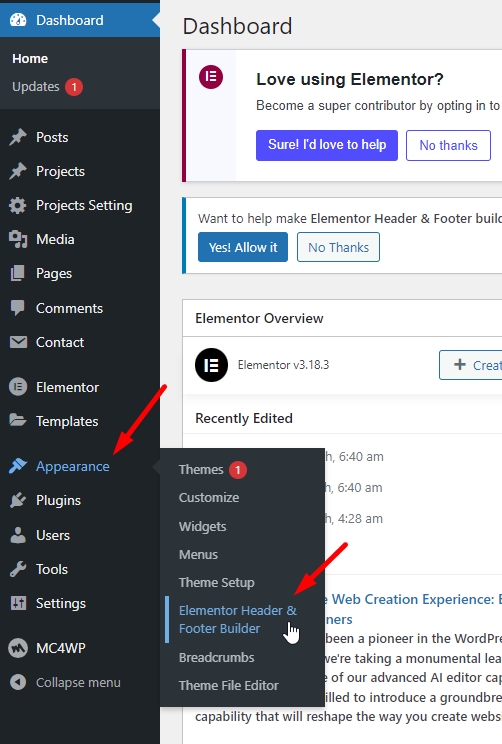 Step 1 - Go to WordPress Dashboard > Appearance > Header & Footer Builder > Add New > Edit with Elementor