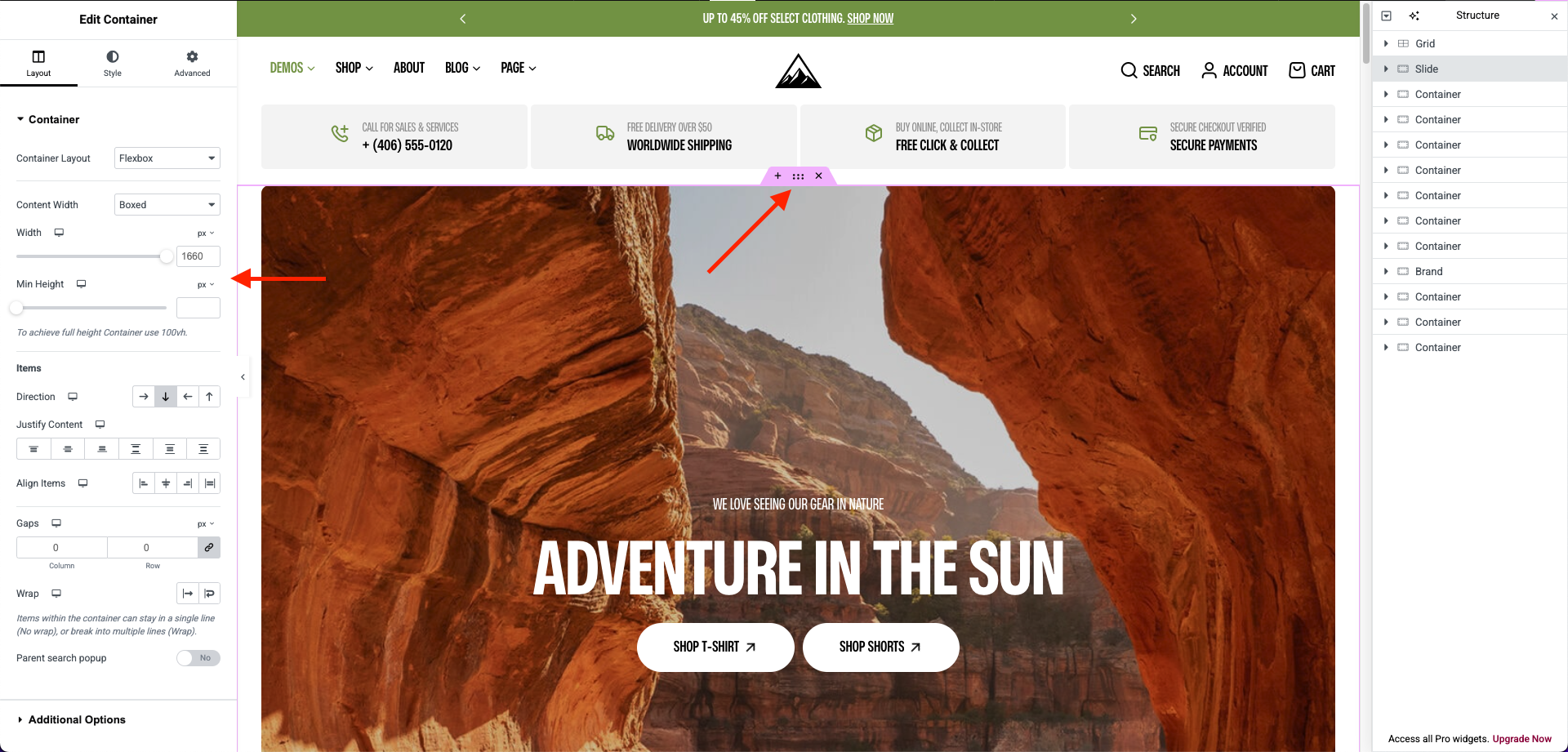 **Step 3** - To modify the container you need to click on the section that you want to edit when you click on to button all content will display in the left sidebar follow you can change it.
