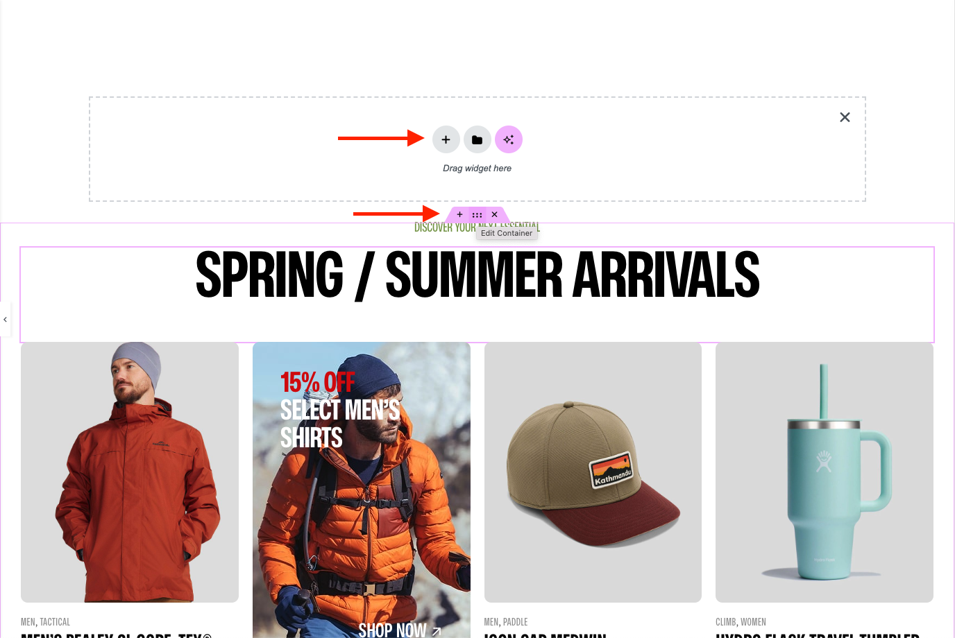 To add a Container or Module please click on to add icon (+) or you can drag an element from the left sidebar.