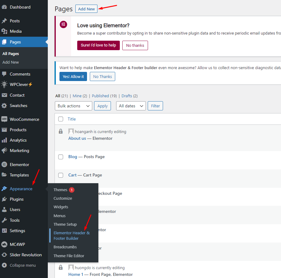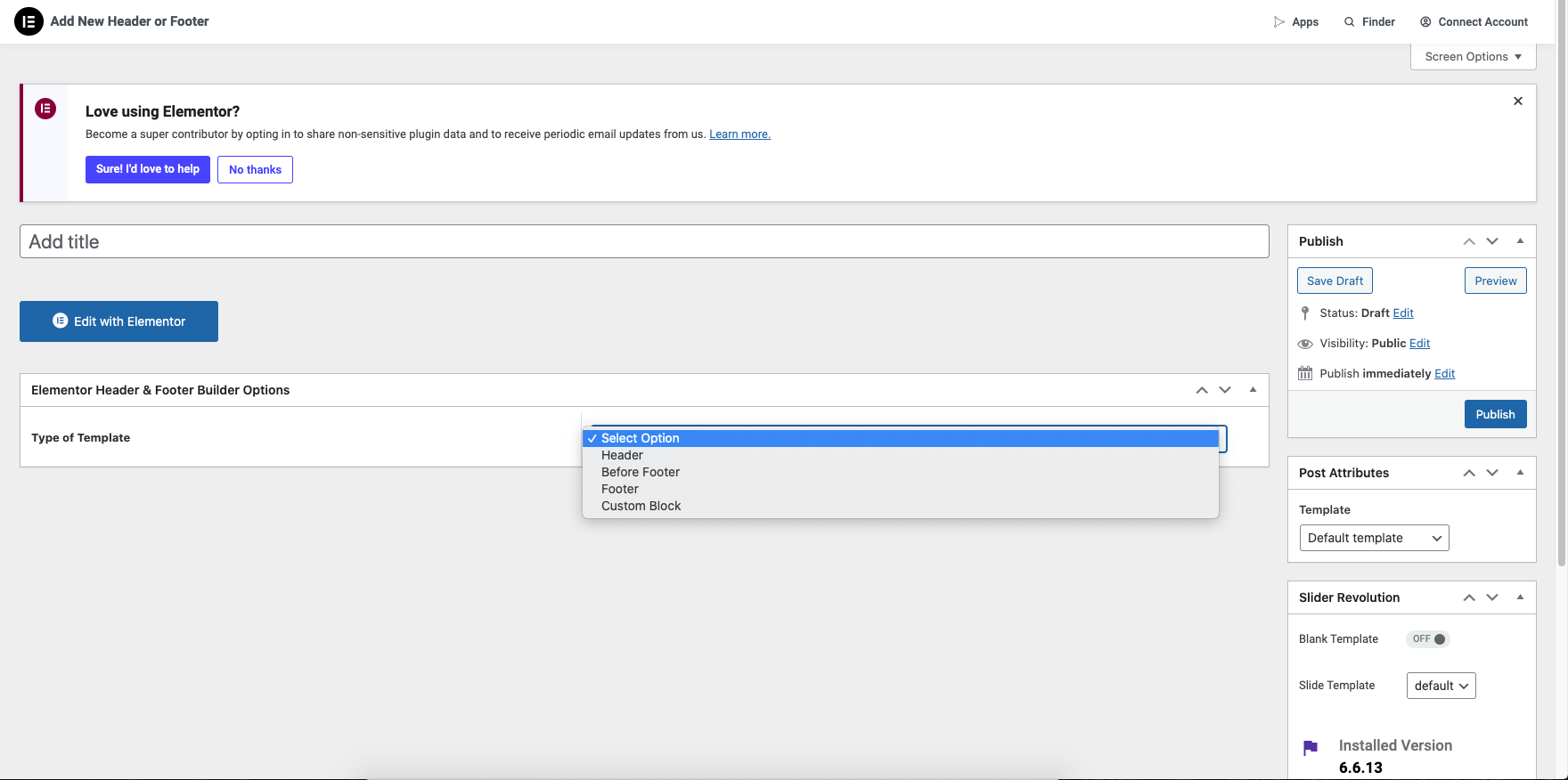 Step 1 - Go to WordPress Dashboard > Appearance > Header & Footer Builder > Add new > Edit with Elementor