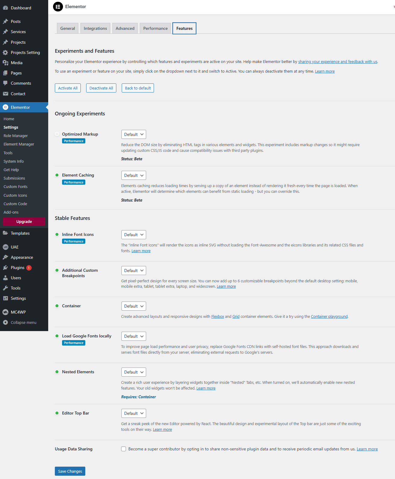 Personalize your Elementor experience by controlling which features and experiments are active on your site. To use an experiment or feature on your site, click on the dropdown next to it and switch to Active. You can always deactivate them at any time.