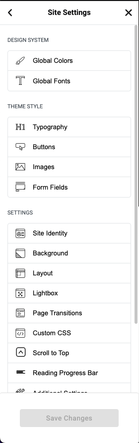 * Global Colors and Global Fonts are at the top of the Site Settings Menu.