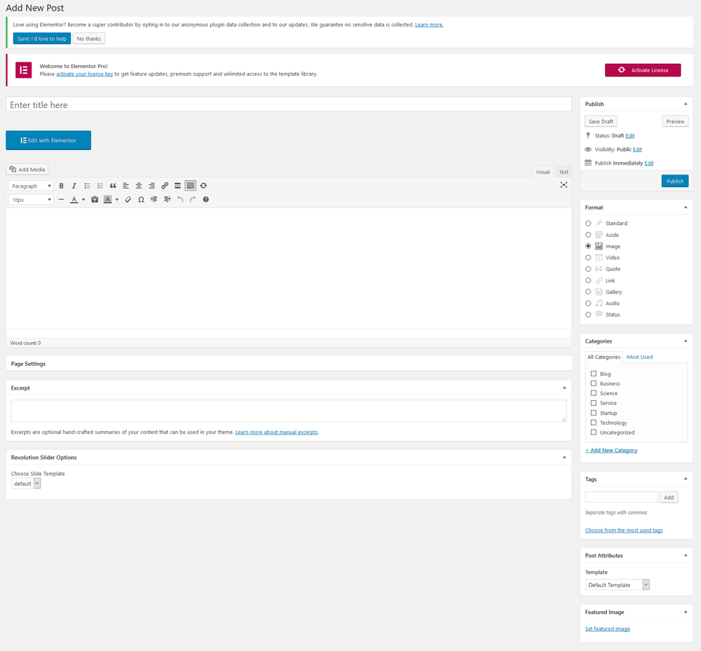 Step 1 - Log in to your WordPress Administration Panel (Dashboard). Step 2 - Click the 'Posts' tab. Step 3 - Click the 'Add New' sub-tab. Step 4 - Start filling in the blanks: enter your post title in the upper field , you can add content of post by use elementor to create. Step 5 - As needed, select a category, add tags, fill in the meta setings below the editor. Step 6 - Upload a featured image for your Post.