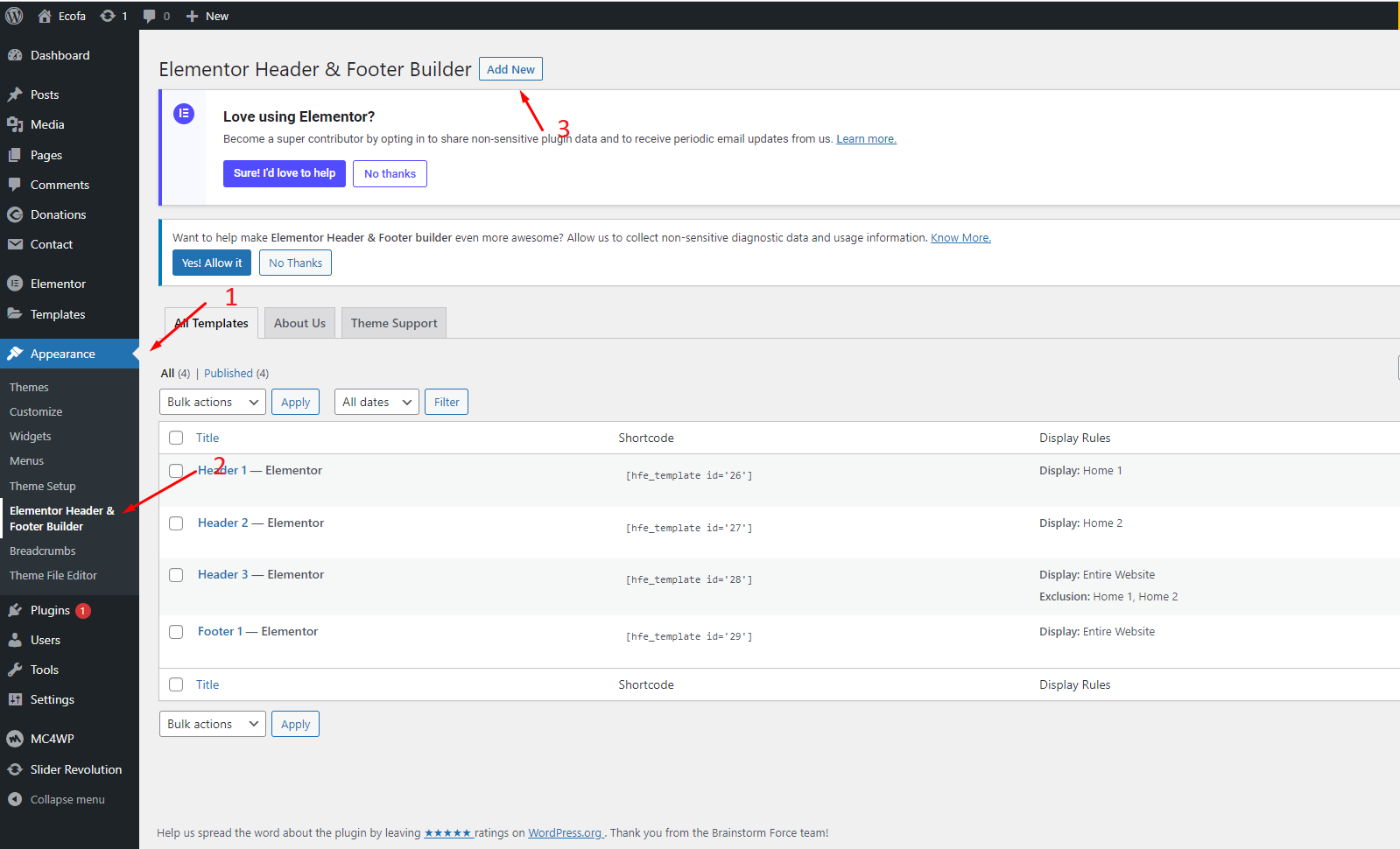 Step 1 - Go to WordPress Dashboard > Appearance > Header & Footer Builder > Add new > Edit with Elementor