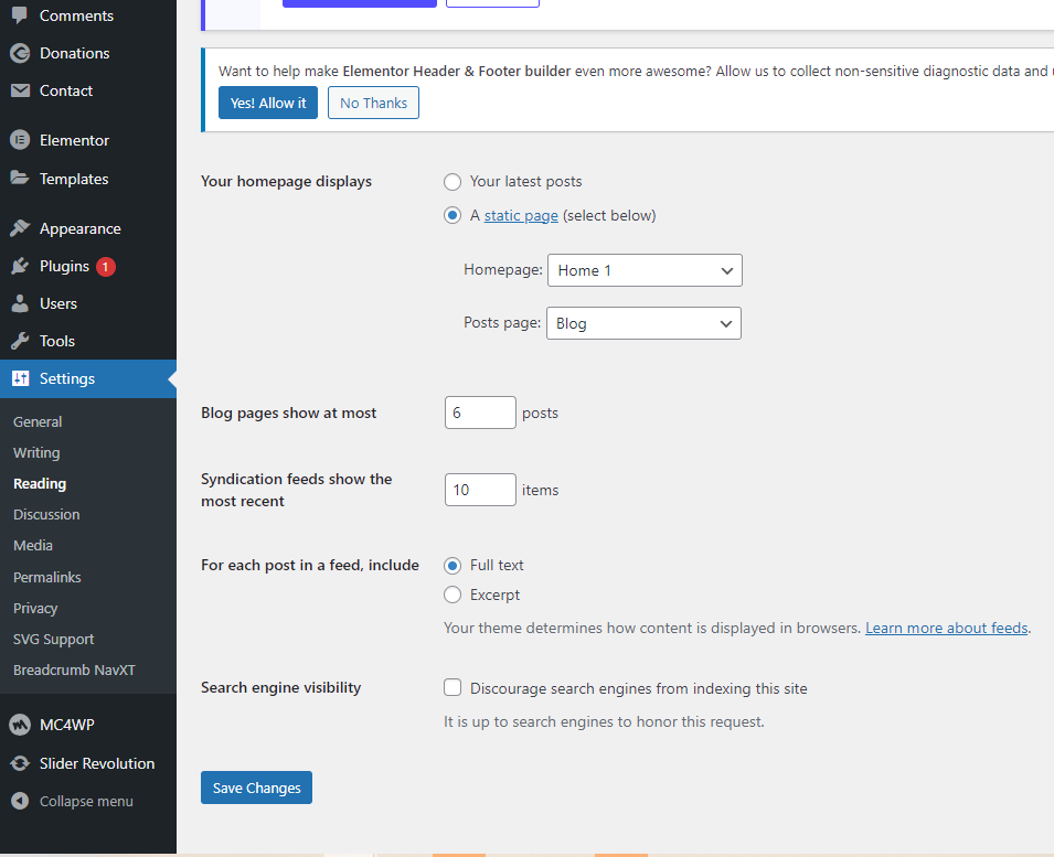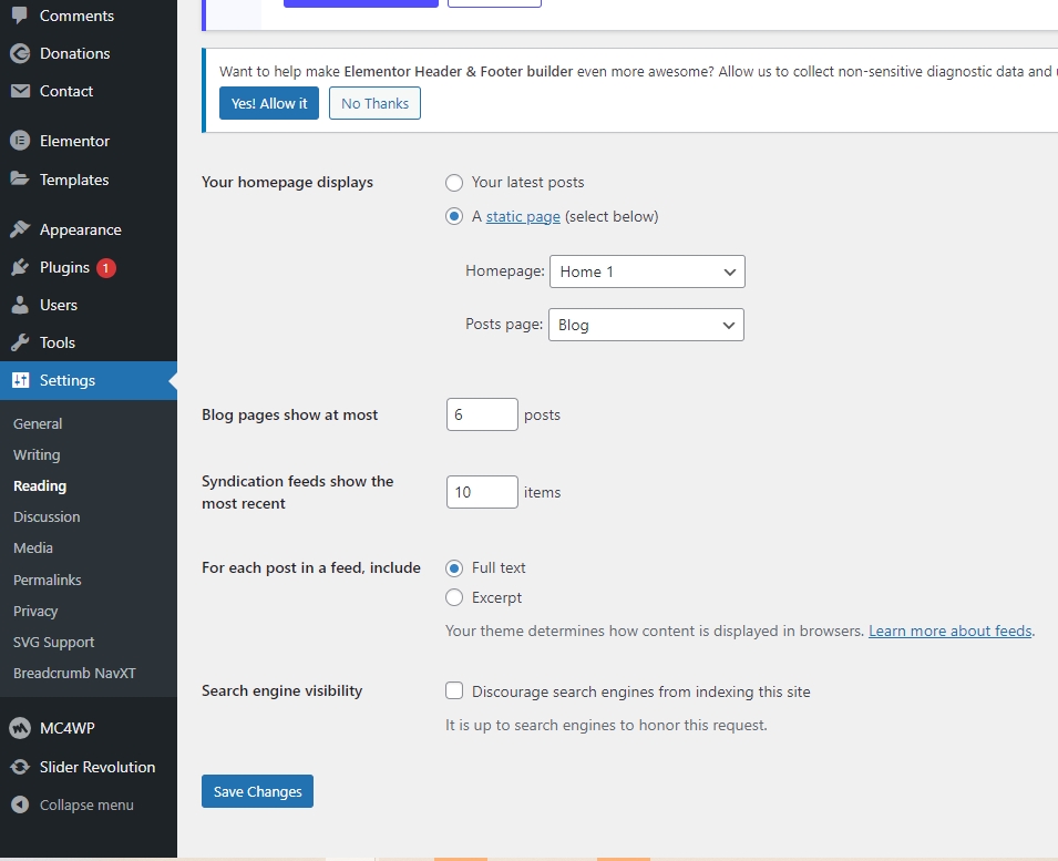 Step 1 - Go to Settings > Reading in your WordPress Dashboard panel.