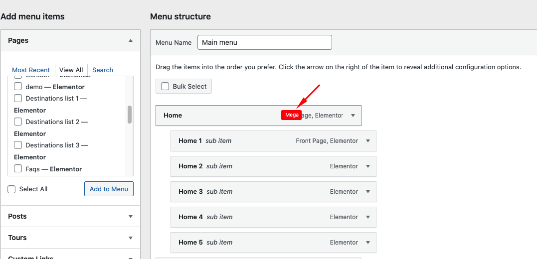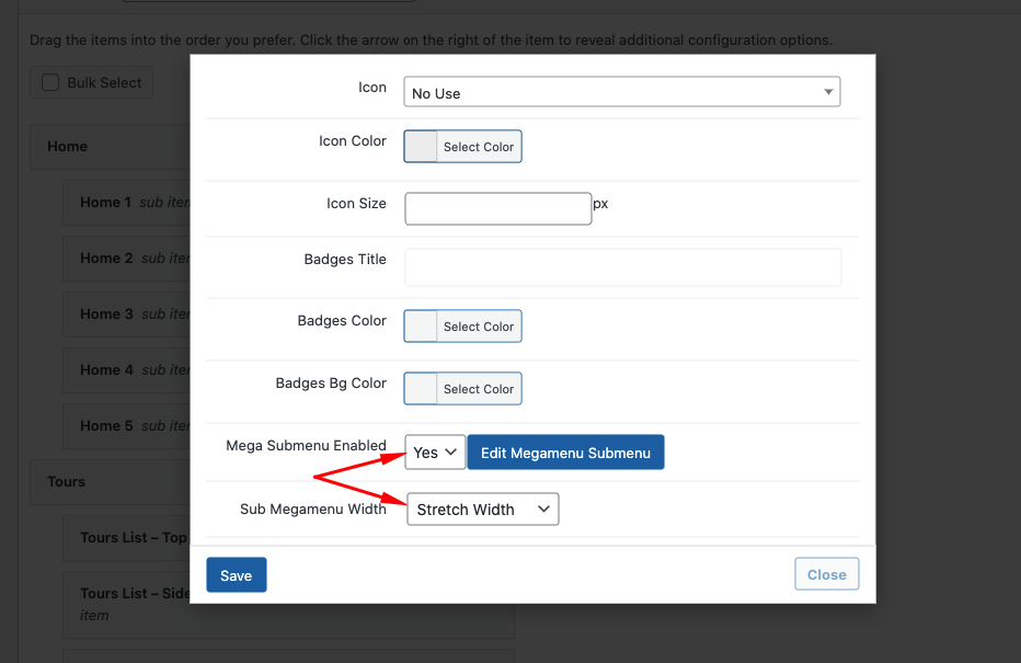 **Step 2** - Choose Menu you want to show the **Mega menu**.