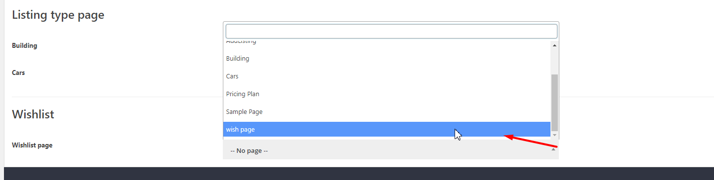 To work with the Wishlist, you need to follow a few steps. You need to select the page for this add-on. You can select page for this from Listing Types ▸ Settings ▸ Pages