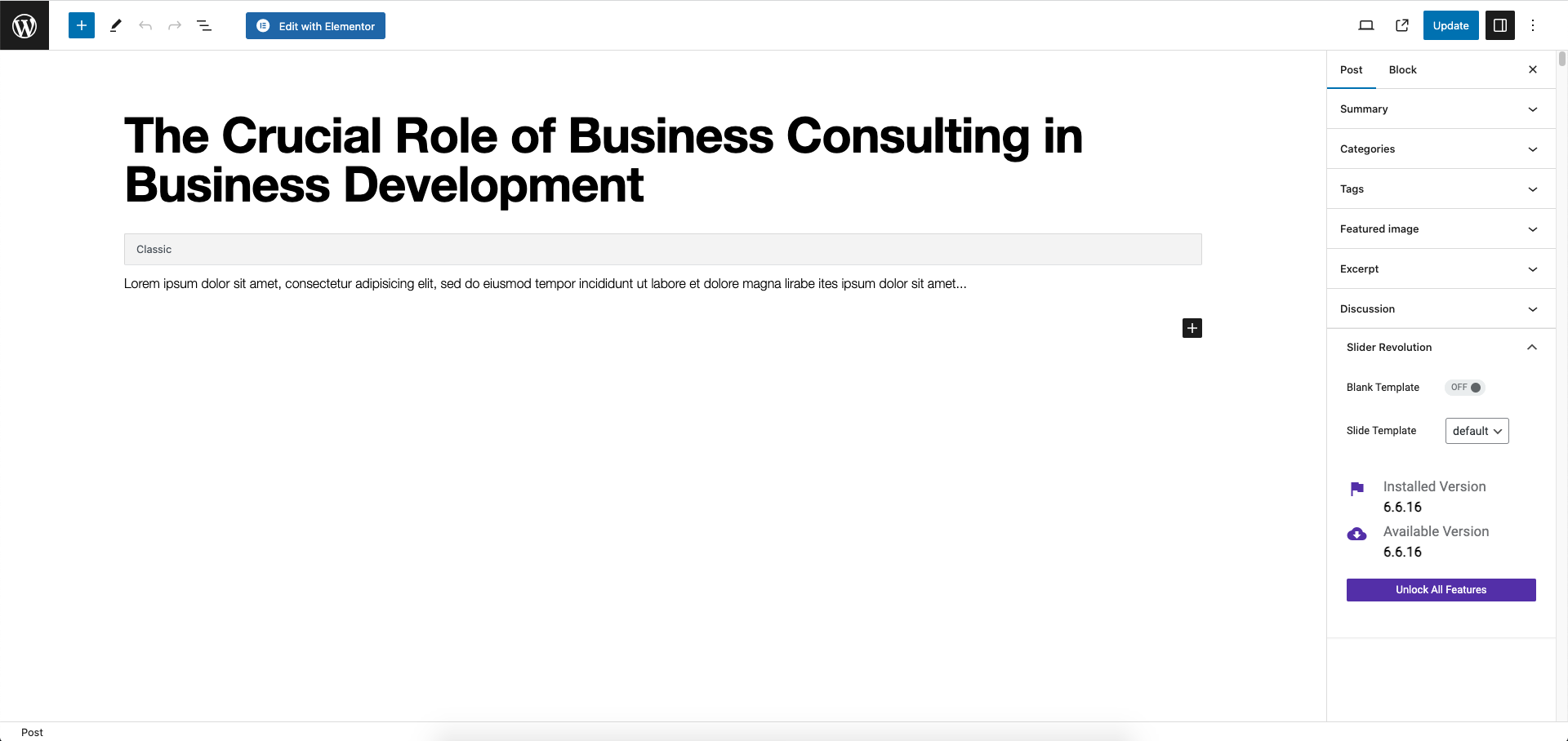 Step 4 - Start filling in the blanks: Enter your post title in the upper field, You can add content to the post by using Elementor to create.